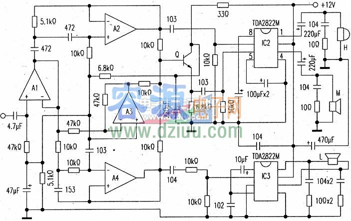 的雙聲道小功率集成塊TDA2822M組成。IC1中的A2和A4同外圍阻容元件構成二階有源濾波的高、低通兩個音頻通道。A3接成反相器,從A2、A3、A4的輸出端