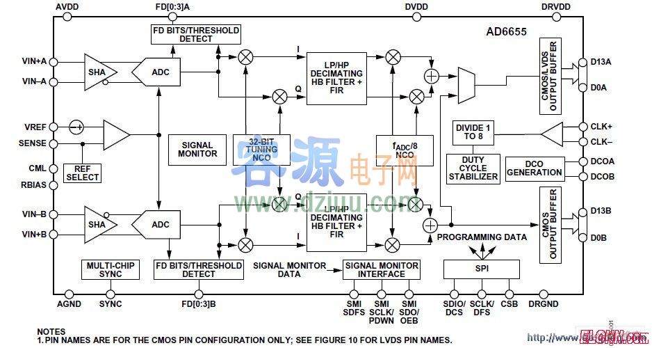 AD6655功能框圖: <<版權(quán)聲明:本文由容源電子網(wǎng)(www_dziuu_com)整理提供,部分內(nèi)容來源于網(wǎng)絡(luò),如有侵犯到你的權(quán)利請與我們聯(lián)系更正。》