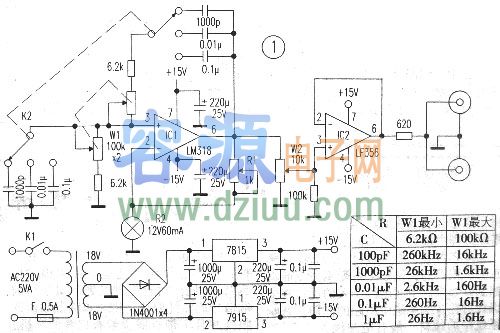 低失真正弦信號的場合,有一臺正弦波發(fā)生器是很必要的,這次的設(shè)計制作可達到這一目的。正弦波振蕩電路有多種,但常用的是文氏電橋振蕩器,圖1是其原理簡圖。在運放的同相輸入端由RC濾波器構(gòu)成正反饋,其諧振頻率決定了振蕩器的振蕩頻率f =1/2πRC; <<版權(quán)聲明:本文由容源電子網(wǎng)(www_dziuu_com)整理提供,部分內(nèi)容來源于網(wǎng)絡(luò),如有侵犯到你的權(quán)利請與我們聯(lián)系更正。》