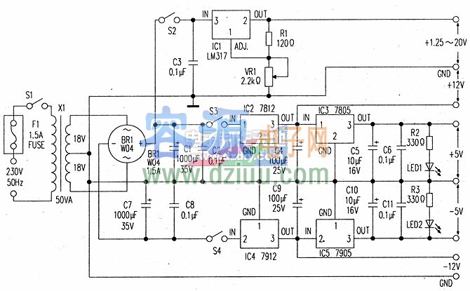 由無源線性集成電路穩壓器組成的電源能夠提供+12, +9, +5, -5, -9和-12伏的直流電。T1和T2是12伏,3安的變壓器。 :