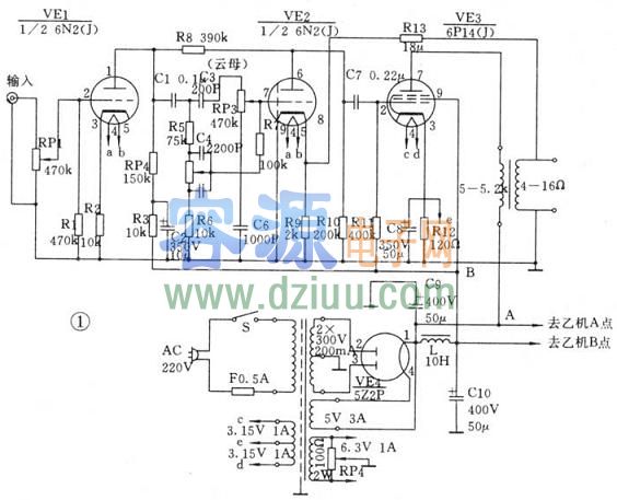 電路是常見的一級輸入放大加長尾倒相推動功放管。小管子是國產的6N1,功放管子也是國產的6P3P,輸出功率是25W。 6P3P:旁熱式陰極束射四極管/低頻功率放大。 :
