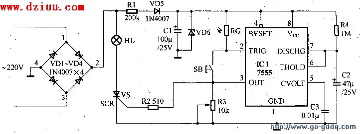 VS是晶閘管,控制燈的亮、滅。其工作原理是:白天當光線照射到光敏電阻RG時,其阻值變得很小,按動按鈕SB,7555的2端不能產生幅度低于VCC/3的觸發負脈沖,故不能使7555的3端輸出高電平來觸發VS使它導通,電燈HL不亮。晚上:RG阻值變大,當按按鈕SB時,7555的2端產生了低于VCC/3的低電平脈沖,從而使7555定時器的3‘端輸出約50s(