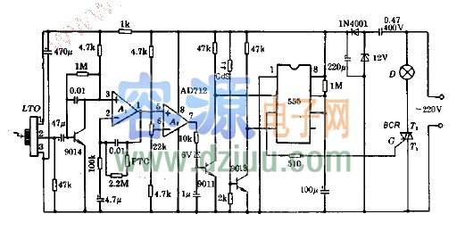 555構成單穩電路,D是受控照明燈。BCR是雙向晶閘管,受555輸出控制。《版權聲明:本文由m.zskn.com.cn整理提供,部分內容來源于網絡,如有侵犯到你的權利請與我們聯系更正。》