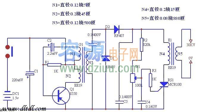 晶體管BG組成一個振蕩器,將1.5V直流電經(jīng)T 1升壓、D整流、C3儲能后供可控硅自動放電回路。接通開關S后,C3兩端的電壓不斷的升高,當電壓升高至某一設定值時(