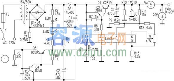 閃亮,調(diào)節(jié)電位器W可使輸出電壓在0~20范圍內(nèi)調(diào)節(jié)。 <<版權(quán)聲明:本文由容源電子網(wǎng)(www_dziuu_com)整理提供,部分內(nèi)容來源于網(wǎng)絡(luò),如有侵犯到你的權(quán)利請(qǐng)與我們聯(lián)系更正。》