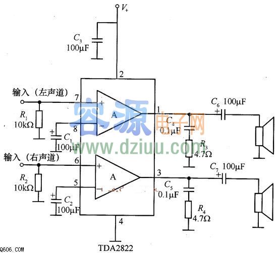 基于TDA2822經典小功放電路 <<版權聲明:本文由容源電子網(www_dziuu_com)整理提供,部分內容來源于網絡,如有侵犯到你的權利請與我們聯系更正。》