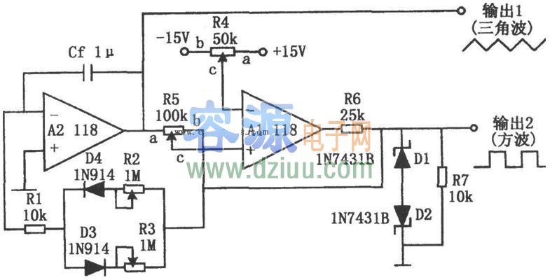 運算放大器A2為積分器,它由運放A1的輸出方波驅(qū)動。方波的振幅由兩個齊納二極管D1、D2固定在5V。電位器R3調(diào)節(jié)三角波的正斜率,R2調(diào)節(jié)三角波的負斜率,R5調(diào)節(jié)三角波的振幅。 <<版權(quán)聲明:本文由容源電子網(wǎng)(www_dziuu_com)整理提供,部分內(nèi)容來源于網(wǎng)絡,如有侵犯到你的權(quán)利請與我們聯(lián)系更正。》