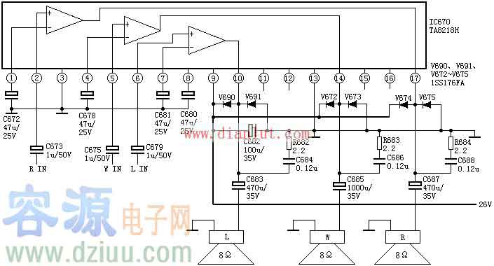 TA8218AH引腳功能及伴音功放電路圖:TA8218AH主要應(yīng)用于彩色電視機(jī)伴音功放電路中,此集成電路支持三聲道音頻信號,采用26V供電,外圍元器件很少,維修方便。詳細(xì)電路及參數(shù)如下: