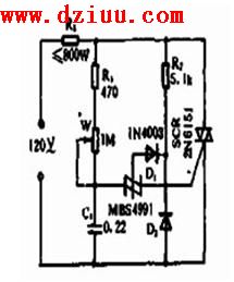 如圖為800W雙向可控調光器電路。該電路使用雙向開關MBS4991對雙向可控硅SCR進行相角控制。調節W可使SCR雙向可控硅導通角在0到170度變化。 <<容源電子網論壇正式上線,為朋友們建立一個友好互動交流平臺,歡迎大家去論壇和朋友們一起分享、學習電子技術。對本文有什么疑問請直接到論壇相應欄目發貼求助。