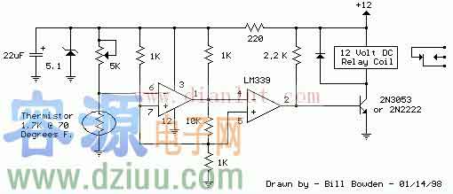 如圖所示是LM339設計的電子溫控器及繼電器電路的電路圖。 本電路是一個簡單的自動調溫器電路,可用于控制,通過繼電器觸點繼電器與供電的一個小空間加熱器。繼電器觸點的額定以上應為