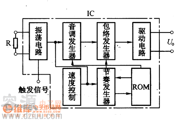 音樂集成電路有許多系列,且在控制功能上也各不相同,但它們的基本電路結構和工作原理大都是相同的。 音樂集成電路的內部電路結構如圖所示,它由控制電路、振蕩電路、存儲器(ROM)、節拍發生器、音階發生器、