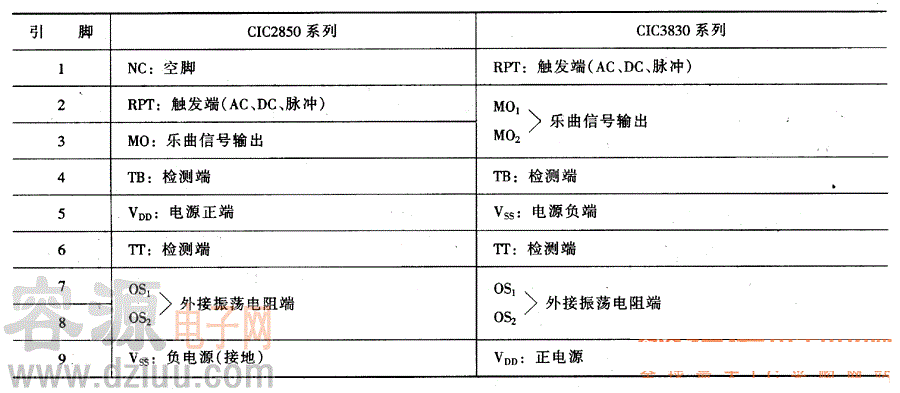 CIC2850/CIC3830系列音樂集成電路是單樂曲發生器,它們的外弓線排列及封裝形式為9腳單排直插式塑封,其引腳功能見表,該系列產品輸出樂曲名見表。 CIC2850/CIC3830系列音樂集成電路引腳功能 CIC2850/CIC3