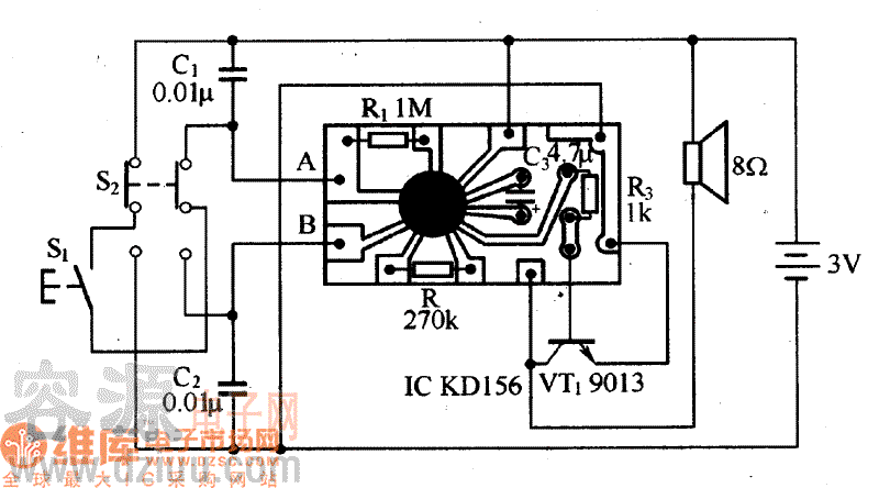 KD-156音樂集成電路可發出"叮咯"及鳥鳴兩種聲響,音響純正悅耳,是用來制作電子門鈴的專用集成電路。用這種集成電路制作的電子門鈴電路,如圖所示。圖中的A、B端為兩個觸發信號輸入端,A為正脈沖觸發端,B為負脈