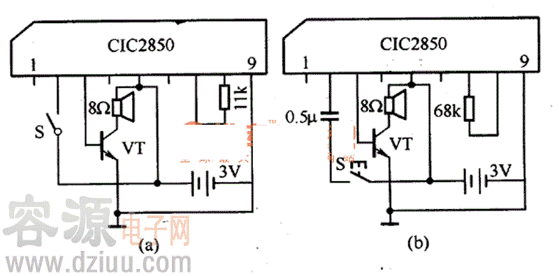 CW9561模擬聲集成電路是一種能發出警報聲、汽笛聲、警車聲及機槍聲的集成電路,它的典型應用電路如圖所示。在圖(a)所示電路中,當開關S2分別置于A、B、C位置,電路可分別發出報警聲、汽笛聲和警車聲;當S1開關閉