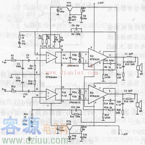 高保真功放集成電路sTK6153組成的2×100W功放電路示意圖