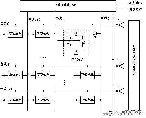 編程數(shù)據(jù)存儲(chǔ)單元以陣列形式分布在FPGA中,編程數(shù)據(jù)存儲(chǔ)單元陣列結(jié)構(gòu)如圖1所示。存儲(chǔ)單元為5管SRAM結(jié)構(gòu), 只有一根位線。其中T管為本單元控制門,由字線控制。數(shù)據(jù)以串行方式移入移位寄存器,而地址移位寄存器順序選中存儲(chǔ)單元的一根字線,當(dāng)某列字線為高電平時(shí), 該列存儲(chǔ)單元的T管導(dǎo)通,從而與位線接通,在寫信號(hào)控制下將數(shù)據(jù)移位寄存器中一個(gè)字的數(shù)據(jù)通過(guò)各列位線寫入該列存儲(chǔ)單元。