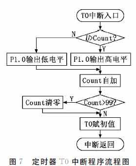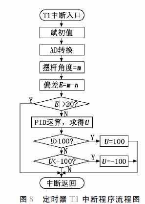 倒立擺系統主程序流程圖見圖6。其中,U為PID運算的輸出值,為輸出PWM波形的占空比,由于所選單片機不具備專用PWM輸出引腳,需要利用定時器T0模擬其波形輸出,定時器T0中斷子程序流程圖見圖7。在本系統中,采樣周期選擇為10ms,由定時器T1控制,定時器T1中斷子程序流程圖見圖8。