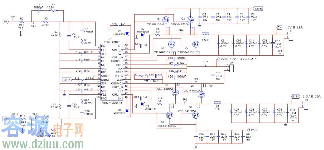 PMP3199 是用于銀盒電源的雙輸出同步降壓設(shè)計(jì)。銀盒電源用在臺式機(jī)中。其輸入電壓為 12V.采用 TPS5124 產(chǎn)生 5V (20A) 和 3.3V (25A) 輸出。該設(shè)計(jì)具有出色的效率(高達(dá) 92%)。主電