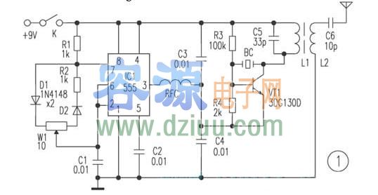 外圍元件構成晶體穩頻電容三點式振蕩器,諧振頻率27.145MHz。VT1振蕩產生的高頻載波經555③腳輸出的方波信號調制,由天線發射出去。 <<版權聲明:本文由容源電子網(www_dziuu_com)整理提供,部分內容來源于網絡,如有侵犯到你的權利請與我們聯系更正。》
