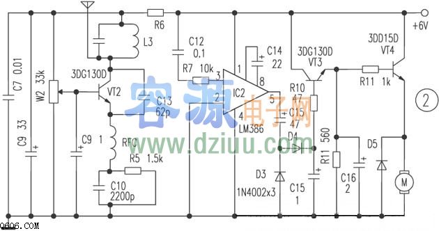 外圍元件構成超再生檢波器,檢出原方波調制信號,經C12、R7送至IC2的③腳,放大后的信號經D3、D4倍壓整流,由VT3射隨器輸出其平滑后的直流電壓。該電壓的大小與發送的不同占空比信號波形有關。 <<版權聲明:本文由容源電子網(www_dziuu_com)整理提供,部分內容來源于網絡,如有侵犯到你的權利請與我們聯系更正。》