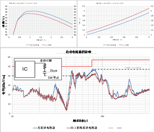 圖8.將啟動電阻器添加到LMR23630轉換器開關節點的影響。EMI輻射較低,但由于開關損耗較高,因此效率有所降低。