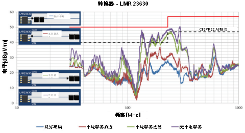 圖11.具有不同輸入電容布局的LMR23630轉(zhuǎn)換器的EMI輻射。