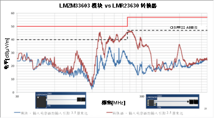 圖14.比較TI LMR23630轉(zhuǎn)換器和LMZM33603電源模塊的EMI特性。