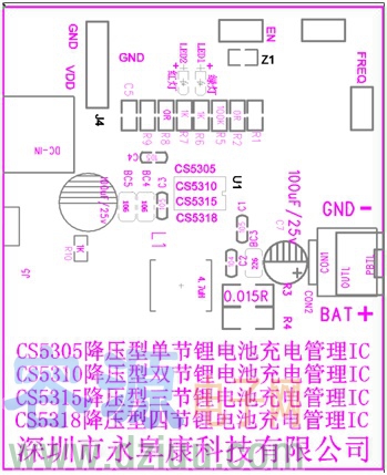 深圳市永阜康科技有限公司結合客戶實際應用方案,推出管腳兼容的單節/兩節/三節/四節鋰電池同步降壓型充電管理芯片系列:CS5305/CS5310/CS5315/CS5318,耐壓高達28V。該系列芯片具有頻率抖動的功能,大大改善系統的EMI特性;充電電流最高可達3A,效率90%以上;全系列型號都具備完整的涓流,恒流,恒壓充電過程;具有終止電流可編程功能,通過設置不同的外部分壓電阻, 可以很方便的調節充電終止電流的大小;各種安全可靠的保護措施以及雙LED燈充電狀態指示,還帶了NTC溫度控制功能;全系列芯片采用獨有的EQA-16封裝,尺寸與SOP-8大小相當。廣泛應用于按摩儀、榨汁機、藍牙音響、廣場舞音響、無人機等案列。