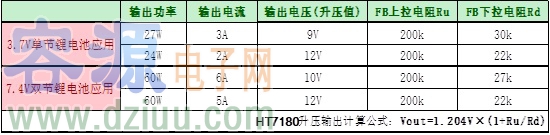 HT7180應(yīng)用于單節(jié)鋰電池升壓、雙節(jié)鋰電池升壓典型參數(shù)如下: