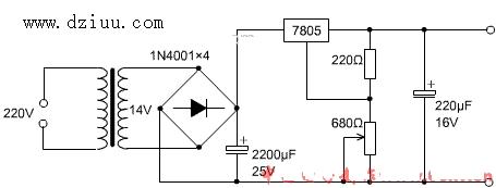 這里選用7805制作了一個5V~12V連續可調的直流穩壓電源實例。圖中R1、R2的取值決定了輸出電壓的可調范圍,