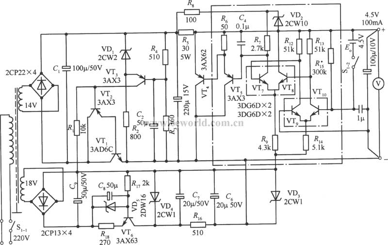 后,得到4.5V 100mA的輸出電壓。電路元器件的參數在電路中,本電路最大的特點