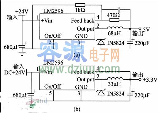 選擇LM2596-5V、LM2596-3.3V、LM2596-1.8V的芯片。要獲得+1.8 V和+5 V時用圖6(a)的接法,要獲得+3.3 V時,用圖6(b)的接法。 <<版權聲明:本文由容源電子網(www_dziuu_com)整理提供,部分內容來源于網絡,如有侵犯到你的權利請與我們聯系更正。》