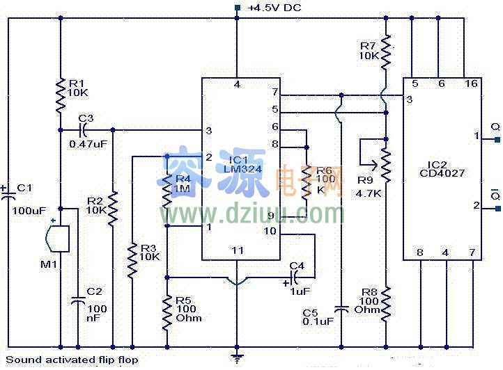 LM324和CD4027構成的聲音操作觸發器電路 <<版權聲明:本文由容源電子網(www_dziuu_com)整理提供,部分內容來源于網絡,如有侵犯到你的權利請與我們聯系更正。》