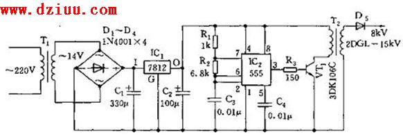 555輸出的高頻振蕩脈沖經R3限流后,加至高頻放大級VT1的基極。該放大器的負載是升壓變壓器T2,經T2的次級升壓,可使次級輸出達12KV的高壓,再經高壓堆或高壓整流管整流后,可穩定輸出 8KV的直流高壓。 <<版權聲明:本文由容源電子網(www_dziuu_com)整理提供,部分內容來源于網絡,如有侵犯到你的權利請與我們聯系更正。》