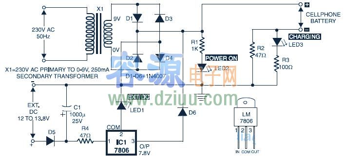 被應用到充滿活力的充電器,在電阻R4后,極性保護二極管D5,限制了輸入電流到安全值。3端子正電壓穩壓器LM7806(IC1)提供固定的7.8V直流電壓輸出,