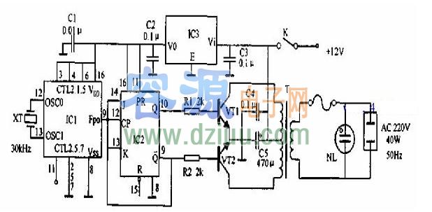 在該電路中,IC1產生準確的100Hz脈沖,經IC2 JK觸發器二分頻變成50Hz方波,并驅動功率管VT1和VT2交替導通變成50Hz方波,再經變壓器T升壓成220V方波輸出。IC3把12V變成+5V做IC1和IC2的工作電源。 <<版權聲明:本文由容源電子網(m.zskn.com.cn)整理提供,部分內容來源于網絡,如有侵犯到你的權利請與我們聯系更正。》