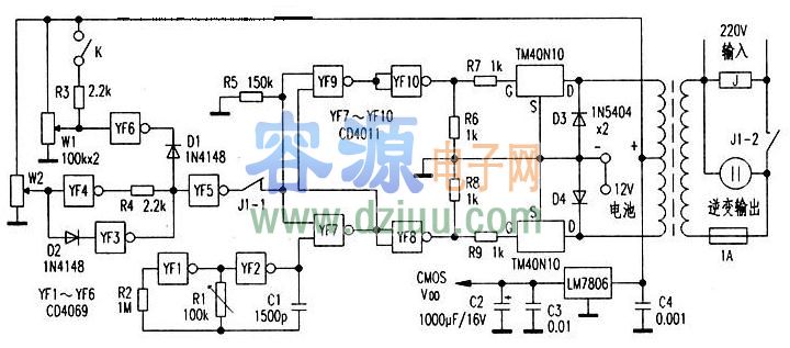 3.由CD4069中的YF6、YF5、W1組成電池過壓開關電路。調節W1,可以設定最高充電電壓為12V。當電池充電到達設定電壓12V時,YF6輸出低電平,YF5輸出高電平,電路反轉,逆變工作。過壓開關電路保護電池,防止過充損壞。D1為隔離二極管,K用作充電未到達設定額定電壓值時的緊急啟動。