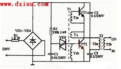 。其工作原理與開關電源相似,二極管VD1~VD4構成整流橋把市電變成直流電,由振蕩變壓器T1,三極管VT1、VT2組成的高頻振蕩電路,將脈動直流變成高頻電流,然后由鐵氧體輸出變壓器T2對高頻高壓脈沖降壓,獲得所需的電壓和功率。R1為限流電阻。電阻R2、電容C1和雙向觸發二極管VD5構成啟動觸發電路。