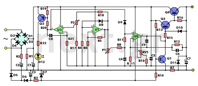| D1,D2,D3,D4 = 1N5402 D5,D6 = 1N4148 D7,D8 = 5.6V齊納二極管 D9,D10 = 1N4148 D11 = 1N4001 D12 = LED |