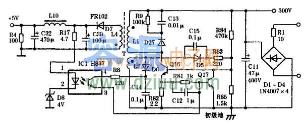 ,該輸出電壓經R17,光耦器發光二極管使穩壓管D8擊穿,光耦器初次級