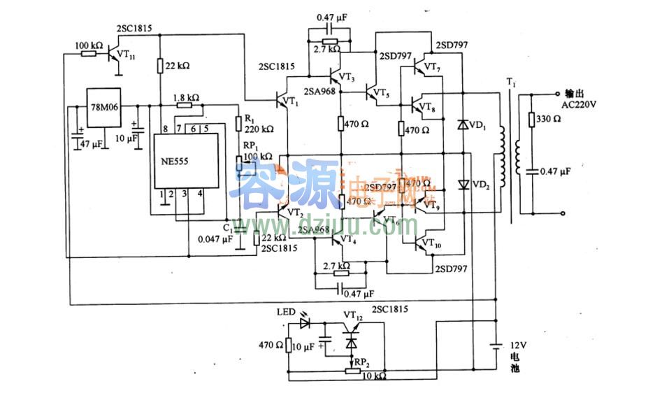 如圖是由NE555等構(gòu)成的逆變器電路,它將蓄電池的十12V直流電壓變換為220V的交流輸出電壓。電路中,NE555為振蕩電路,振蕩頻率由R1、RP1的阻值和C1決定,調(diào)節(jié)RP1的阻值,使其為50HZ。NE555的3腳輸出脈沖信號(hào),一路直接加到VT2的基極,另一路經(jīng)VT11反相器加到VT1的基極,VT1,和VT2得到相位差180°的脈沖電壓,該脈沖電壓經(jīng)VT1和VT2進(jìn)行整形,再經(jīng)VT3和VT4進(jìn)行脈沖放大,驅(qū)動(dòng)由VT5、VT7、VT8和VT6、VT9、VT10構(gòu)成的功率放大器。功率放大器開(kāi)關(guān)工作可將+12V電池電壓變換為方波電壓,該電壓經(jīng)升壓變壓器T1變?yōu)?20V的方波交流輸出電壓。VD1和VD2為浪涌吸收二極管,VT12,等為阻止電池過(guò)放電的電路,78M06為NE555提供+6V穩(wěn)定的工作電壓。