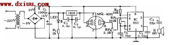 ;當QM型器敏元件檢測到可燃氣體或煙霧時,A—B極間的阻值降低,使4腳電位上升,使得555起振。并通過3腳輸出端驅動蜂嚀器發出報警聲。