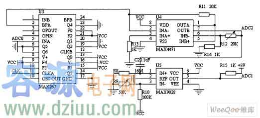 如圖所示,電路由濾波和放大兩部分組成。其中MAX267是MAXIM公司出產(chǎn)的一個(gè)集成濾波器,可以構(gòu)成低通、帶通、高通、等多種方式,使用靈活,性能遠(yuǎn)遠(yuǎn)優(yōu)于采用集成運(yùn)放組成的濾波電路。