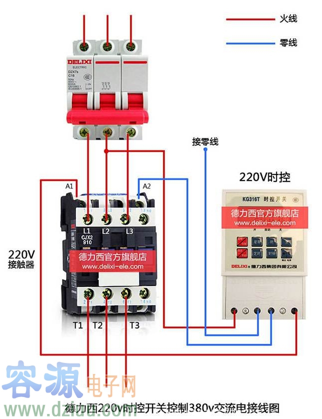 從德力西時控開關接線圖中可以看出,kg316t時控開關和交流接觸器線圈電壓都是交流220V。