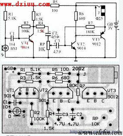 本電路由話筒、前置低放、功率放大電路和耳機等部分組成。原理電路圖見圖1,其印刷板電路圖見圖2。