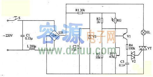 光控電路由光敏電阻器RG、電阻器肥-R4、電位器RP、電容器C3、晶位管V1、雙向觸發二極管V2和晶閘管VT組成。 <<版權聲明:本文由容源電子網(www_dziuu_com)整理提供,部分內容來源于網絡,如有侵犯到你的權利請與我們聯系更正!