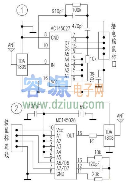 MC145026編碼電路的數據傳送端D6和D7接受鼠標數據線1和數據線2傳來的數據,并在芯片內部編碼后經射頻發射模塊TDA1808發射出去。 <<版權聲明:本文由容源電子網(www_dziuu_com)整理提供,部分內容來源于網絡,如有侵犯到你的權利請與我們聯系更正。》