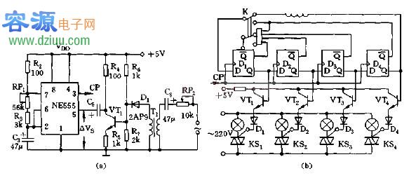 ,電路由音控多諧振蕩器、時序脈沖產生器和可控硅觸發電路等組成。