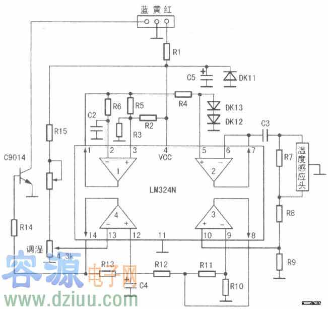另外,亞都YC-D22還有自動(dòng)恒濕控制電路,如下圖所示。它以LM324N四運(yùn)算放大器為主體,傳感器為“濕度感應(yīng)頭”,組成比較電路。濕度感應(yīng)探頭根據(jù)空氣中的濕度得到濕度電信號(hào),與基準(zhǔn)電壓相比較,得出“比較電壓”,去控制調(diào)整管C9014的偏置電流,也就是控制C9014內(nèi)阻的大小,經(jīng)拔插線排中的藍(lán)線,去控制振蕩管BU406的B極偏置電流,即控制換能器的振蕩幅度,也就是控制了蒸發(fā)量,達(dá)到溫度自控的目的。