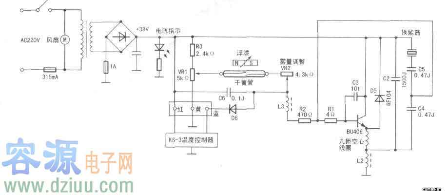 該機(jī)還設(shè)有無(wú)水保護(hù)電路。BU406的偏置電路為:電源+38V→R3→VR1→干簧管→VR2→L3→R2→R1。其中,干簧管置于水池中的一個(gè)豎直的空心立柱內(nèi),立柱上套有一個(gè)環(huán)形浮漂,漂內(nèi)為永久性磁鐵。加水后,水池內(nèi)帶磁鐵的浮漂受浮力的作用,上升到立柱的中腰處,即為柱內(nèi)干簧管的半中腰處。干簧管兩簧片閉合,BU406偏置電路接通,加濕器正常使用。如水耗干,浮漂落下,干簧管兩簧片斷開(kāi),偏置電路斷路,則電路停振,達(dá)到保護(hù)BU406與換能器的目的。